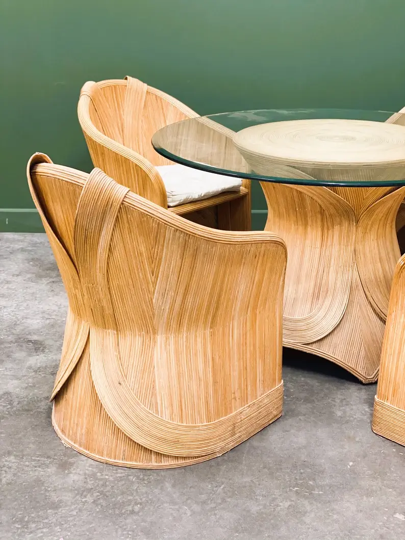 Spectacular Vintage Pencil Reed Bamboo Round Dining Table With 4 Lounge Chairs B